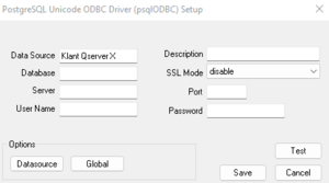 - Voer vervolgens in het menu "PostgreSQL-database" waarden in voor "Server" en "Database".