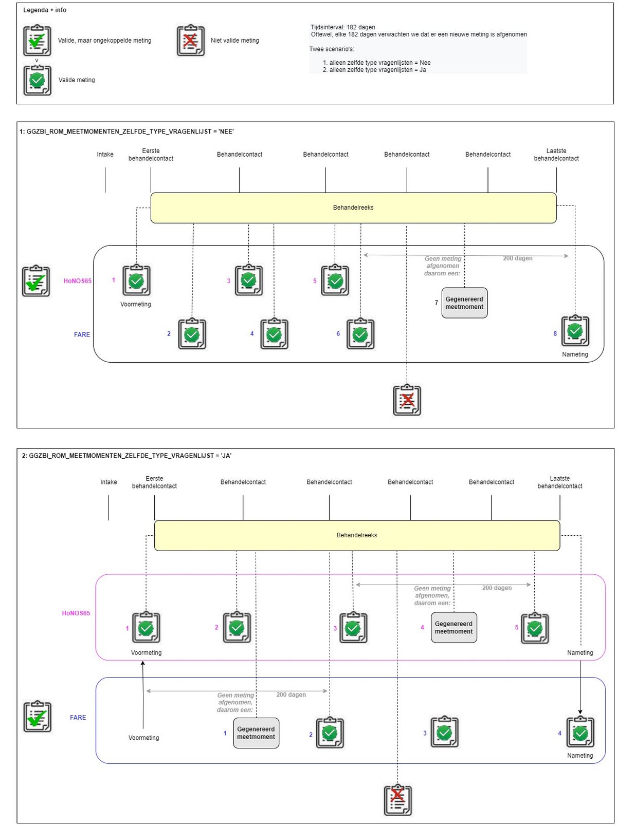 Mits er een valide meting heeft plaatsgevonden in de reeks, bepalen we of de meting een valide voor- of nameting is aan de hand van een marge rondom het eerste- of laatste behandelcontact. Deze marges worden bepaald aan de hand van parameters BI_MARGE_RONDOM_EERSTE_BEHANDELCONTACT_VOORMETING en BI_MARGE_RONDOM_LAATSTE_BEHANDELCONTACT_NAMETING .