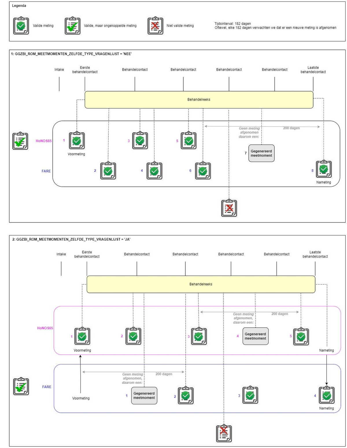 Mits er een valide meting heeft plaatsgevonden in de reeks, bepalen we of de meting een valide voor- of nameting is aan de hand van een marge rondom het eerste- of laatste behandelcontact. Deze marges worden bepaald aan de hand van parameters BI_MARGE_RONDOM_EERSTE_BEHANDELCONTACT_VOORMETING en BI_MARGE_RONDOM_LAATSTE_BEHANDELCONTACT_NAMETING .