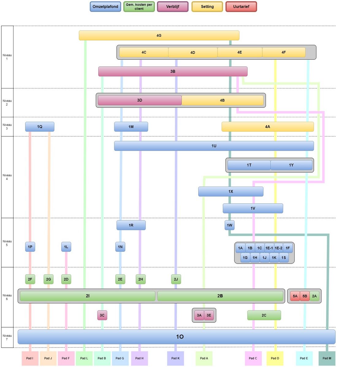 Het ontdubbelen gebeurt op 7 verschillende niveaus waarbij de paden door de VAR-categorieën lopen zoals in onderstaande diagram:
