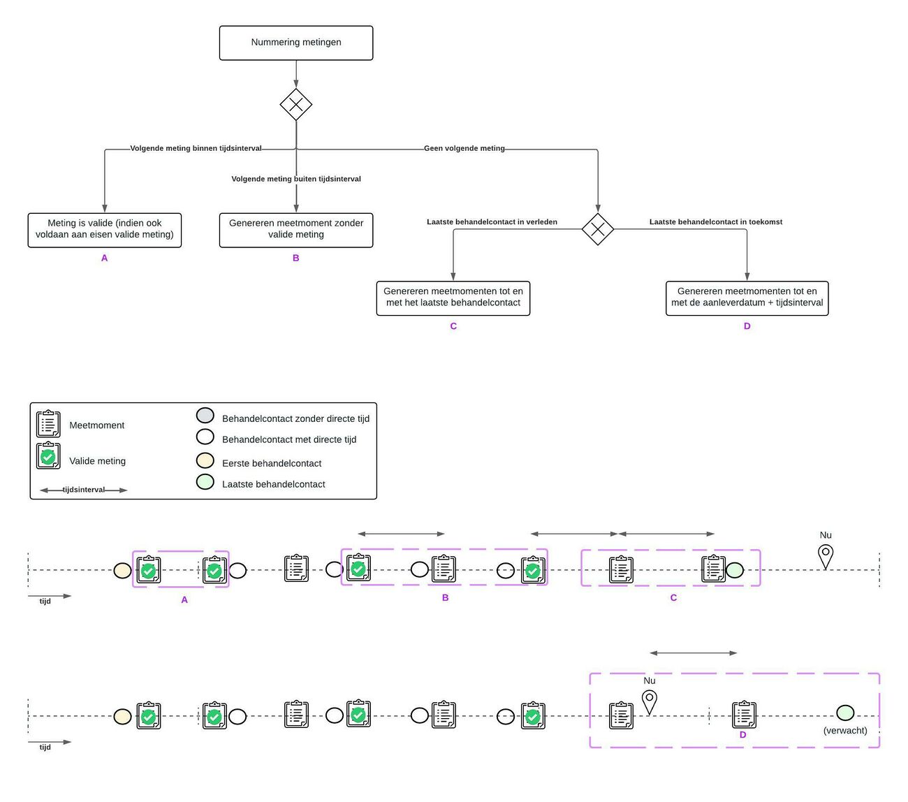 • Mits er geen valide meting te vinden is, dan is een reeks enkel bepaald op basis van de inschrijving, diagnose, en het zorgtraject. In dit geval zullen er dan ook geen geldige metingen te tonen zijn in de dataset. Er worden wel twee meetmomenten gegenereerd, namelijk het verwachte voormeetmoment en het verwachte nameetmoment.