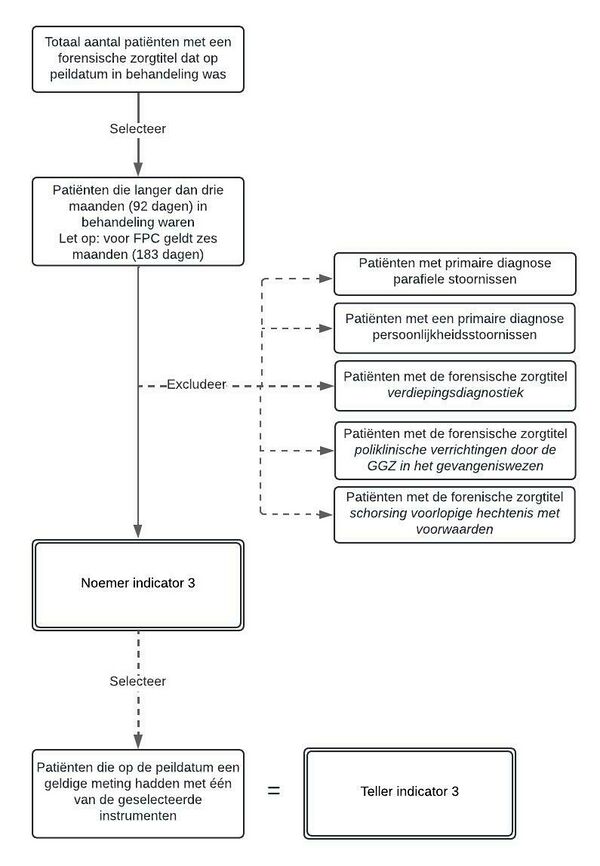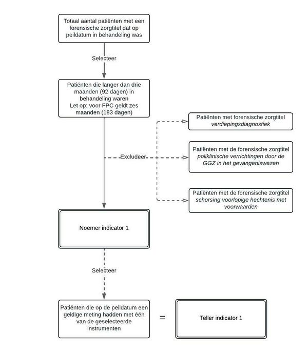 | Geldige meting | Zie voor de geselecteerde instrumenten en de voorgeschreven meettermijn de tabellen bij indicator 1 en 3. Patiënten die langer dan drie maanden (voor setting FPC 6 maanden) in behandeling zijn, dienen altijd een aantoonbaar geldige meting te hebben met één van de geselecteerde instrumenten die is afgenomen binnen de voor het instrument voorgeschreven meettermijn. Instellingen zijn zelf verantwoordelijk voor de processen, geldige metingen en het periodiek meten. |
