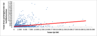 - Maak een puntenwolk door de totale direct patiëntgebonden tijd van een hoofdbehandelaar af te zetten tegen de totale tijd van de DBC (X-as de totale tijd van de DBC; Y-as de totale patiëntgebonden tijd door de hoofdbehandelaar, beide uitgedrukt in minuten). Iedere DBC vertegenwoordigd een punt