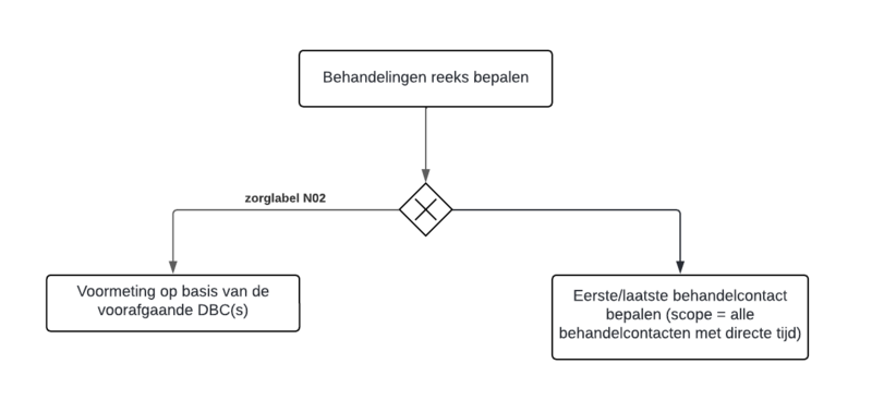 • Mits er een valide meting heeft plaatsgevonden in de reeks, bepalen we of de meting een valide voor- of nameting is aan de hand van een marge rondom het eerste- of laatste behandelcontact. Deze marges worden bepaald aan de hand van parameters BI_MARGE_RONDOM_EERSTE_BEHANDELCONTACT_VOORMETING en BI_MARGE_RONDOM_LAATSTE_BEHANDELCONTACT_NAMETING .