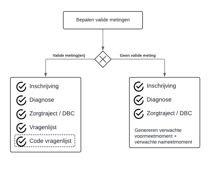 • Mits er een valide meting te vinden is, dan wordt de behandelreeks, en (optioneel) type vragenlijst meegenomen in de behandelreeks.
