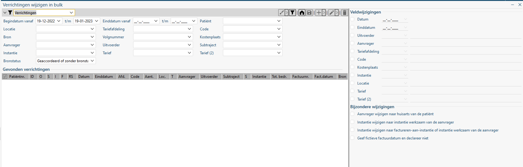 Via het onderstaande scherm kunnen in HiX in bulk mutaties worden toegepast op verrichtingen. Op dit moment zijn nog een bescheiden hoeveelheid operatoren beschikbaar.